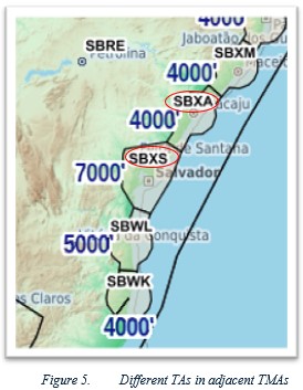 TA harmonization increases Safety levels, especially for TMAs that currently have different TAs and are adjacent. This is the case of the Aracaju TMA (SBXA) with a TA of 4000' and the Salvador TMA (SBXS) with a TA of 7000' (Figure 5). An aircraft flying at level 060 inside the Aracaju TMA (SBXA) would be using QNE setting, while another aircraft at 5000' at the Salvador TMA (SBXS) would be using QNH setting. Depending on the altimeter setting, the separation may be less than 1,000'.